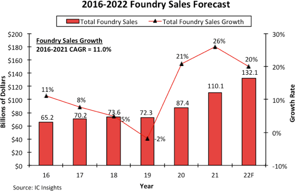 報告顯示,全球晶圓代工市場(chǎng)在2019年下降2%之后,受惠于5G智能手機應用處理器和其他電信設備的銷(xiāo)售推動(dòng),在2020年實(shí)現了21%的強勁反彈。該市場(chǎng)在2021年繼續增長(cháng),增長(cháng)了26%。如果IC Insights預計的今年全球晶圓代工市場(chǎng)增長(cháng)20%能夠實(shí)現,那么2020-2022 年期間將是整個(gè)晶圓代工市場(chǎng)自2002-2004年以來(lái)最強勁的三年增長(cháng)跨度。