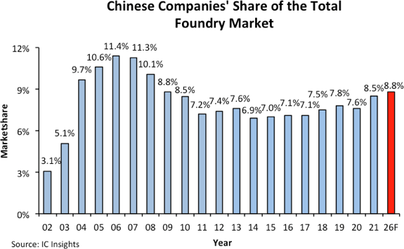 IC Insights在近期更新了《2022 麥克林報告》,預測了全球目前到2026年純晶圓代工市場(chǎng)份額的變化。2021年,中國大陸在純晶圓代工市場(chǎng)的份額相比2020年提高了 0.9個(gè)百分點(diǎn)至8.5%。預計到2026年,大陸代工企業(yè)將占純代工市場(chǎng)8.8%的份額,比2006年11.4%的峰值份額低2.6個(gè)百分點(diǎn)。